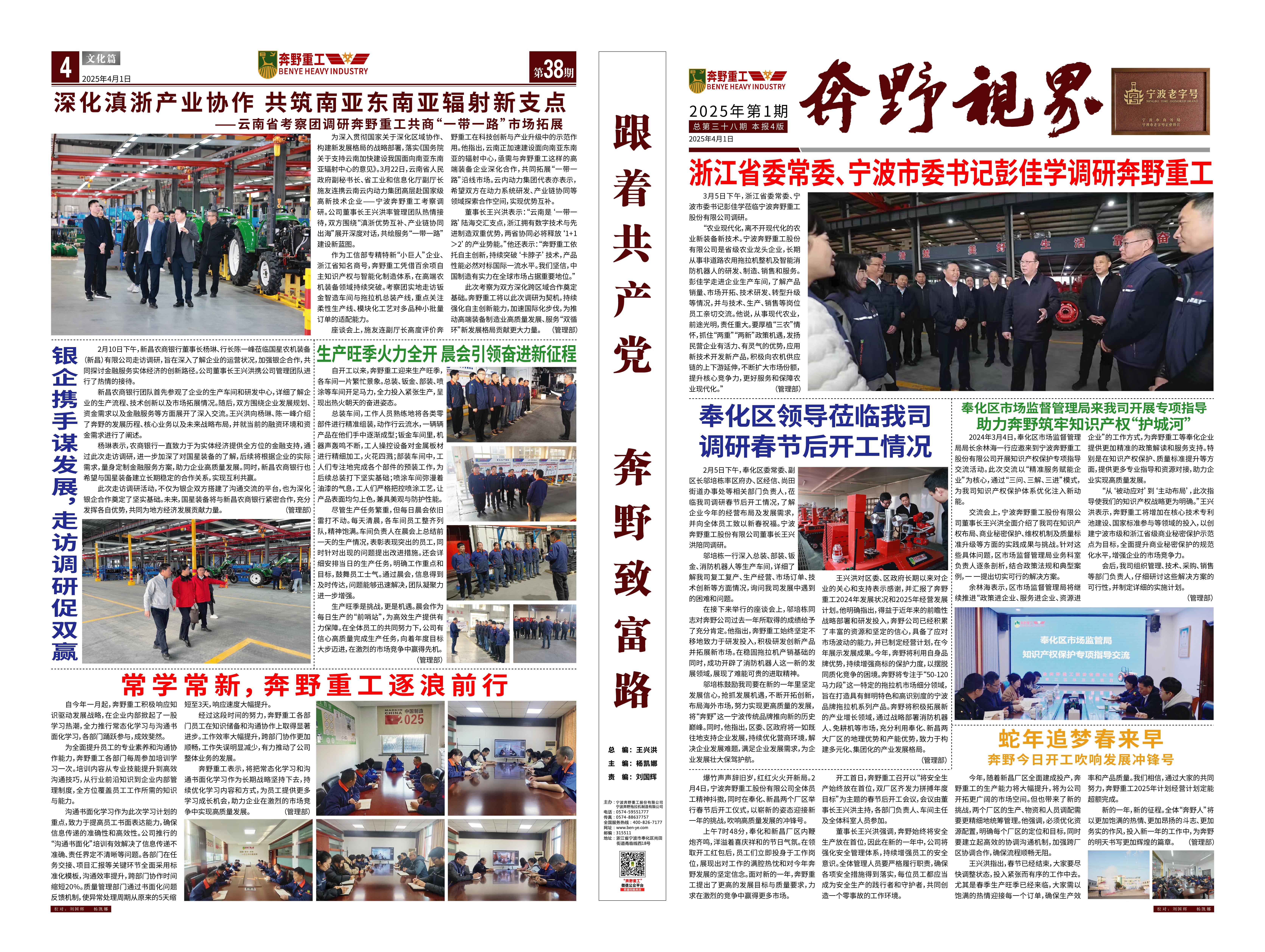 是一家非道路用農(nóng)用拖拉機(jī)整機(jī)及部件設(shè)備研發(fā)、制造、銷售、服務(wù)為一體的涉農(nóng)科研型生產(chǎn)企業(yè),專業(yè)生產(chǎn)寧波型奔野系列拖拉機(jī),是國家高新技術(shù)企業(yè)、工信部專精特新“小巨人”企業(yè)、浙江省知名商號,寧波市級農(nóng)業(yè)龍頭企業(yè)、脫貧攻堅(jiān)-產(chǎn)業(yè)合作樣板企業(yè)、鄉(xiāng)村振興先進(jìn)集體,在寧波、新昌、吉林等地均設(shè)有生產(chǎn)基地,占地150多畝。公司現(xiàn)有技術(shù)骨干30多人,零部件自制化水平達(dá)到30%以上。公司目前擁有發(fā)明專利10余項(xiàng),實(shí)用新型專利、外觀專利、版權(quán)近50項(xiàng),擁有自主的知識產(chǎn)權(quán)保護(hù)品牌。公司所處的農(nóng)業(yè)農(nóng)機(jī)領(lǐng)域是國家重點(diǎn)關(guān)注和保障的、關(guān)乎國計(jì)民生的領(lǐng)域,得到國家和地方政府的大力支持,行業(yè)發(fā)展勢頭良好。